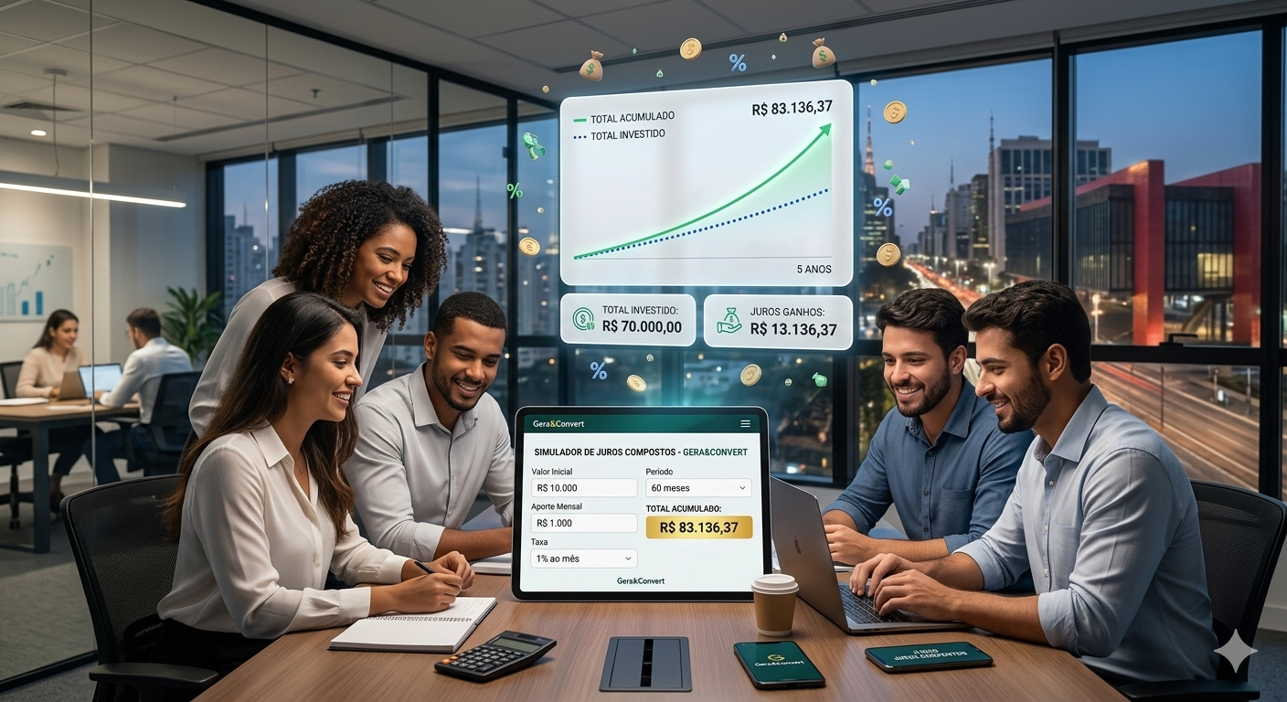 Deseja entender como o tempo e a taxa de juros influenciam o crescimento do seu patrimônio? Os juros compostos, frequentemente chamados de a “oitava maravilha do mundo”, são o motor dos grandes investidores. Para ajudar você a visualizar esse poder, o Gera&Convert criou o Simulador de Juros Compostos Completo.