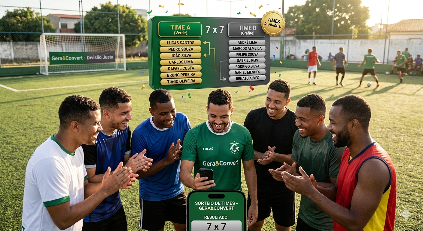 No Gera&Convert, criamos o Sorteador de Times e Grupos Profissional, a ferramenta definitiva para quem quer imparcialidade total e agilidade na organização de qualquer evento.